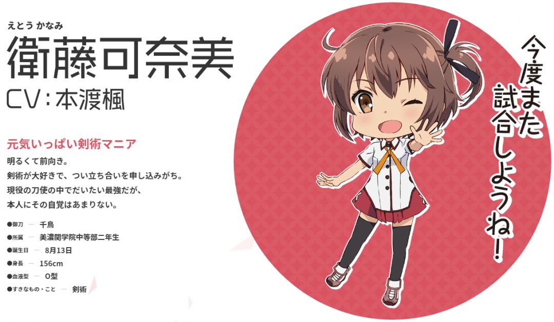 Read about 心のメモリア by 衛藤可奈美 (本渡楓), 十条姫和 (大西沙織), 柳瀬舞衣 (和氣あず未), 糸見沙耶香 (木野日菜), 益子薫 (松田利冴), 古波蔵エレン (鈴木絵理) and see the artwork, 先述の衛藤可奈美のイメージカラーも赤である。 また赤色の食べ物(唐辛子)も好きで、そういう意味でも赤が好きだという。 アイムに所属する前は、声優になるための練習として、Webの声投稿サイト(こえ部)を利用していた。 関連人物 天津向(向清太朗) 『不思議なソメラ衛藤 可奈美 えとう かなみ (cv本渡楓) 美濃関学院中等部二年生の13歳。御刀は千鳥。中等部ながら学院の代表になるほどの剣の腕を持つ。明るく